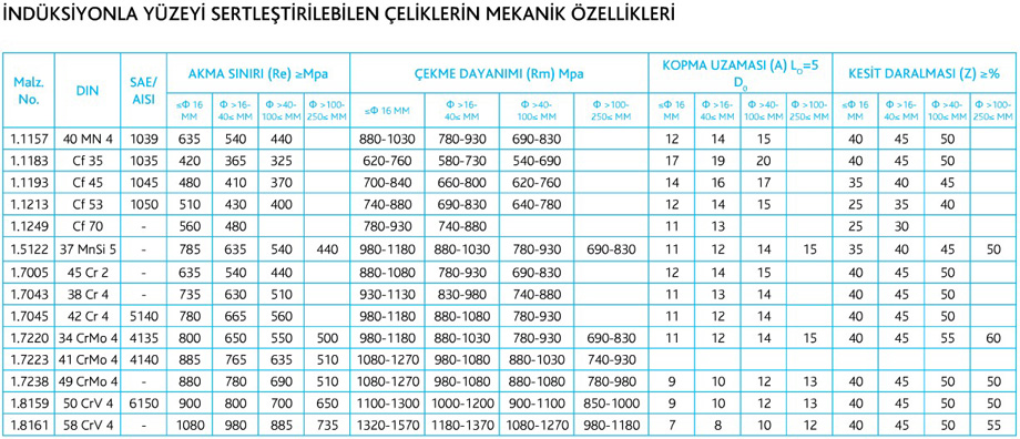 Islah çeliklerinin tamamı indüksiyonla sertleştirilebilir olmasına rağmen, %0,30-0,70 arası karbon içeren indüksiyonla sertleştirilebilen çeliklerin yapı özellikleri daha iyidir. indüksiyonla sertleştirilebilen çelikler 50-60 HRC arası sertlik alabilirler ve yüzey-çekirdek bölge arası sertlik geçişi, ıslah çeliklerine göre daha iyidir. Islah çeliklerinin mangan miktarının nispeten yüksek oluşu indüksiyonla sertleştirme esnasında çatlak oluşma riskini artırır. Bu sebeple indüksiyonla sertleştirilebilen çeliklerde mangan miktarı düşürülmüştür. SAE 1050 malzemenin mangan oranı %0,60-0,90 arası iken Cf 53 malzemede bu oran %0,40-0,70 oranlarındadır. Ayrıca kükürt ve fosfor miktarı bu çeliklerde daha düşüktür.